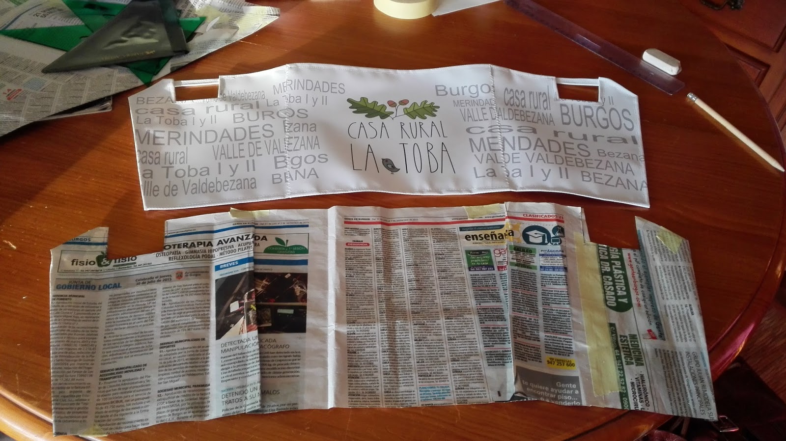 La publicidad para la cesta fue un poco más laboriosa ya que había que darle la forma y dejar hueco par el asa Primero con papel de periódico, el molde o patrón, y cuando ya estás seguro de que queda bien, colocándolo donde irá la lona, pones el patrón encima de la lona, marcas con un lápiz y cortas
